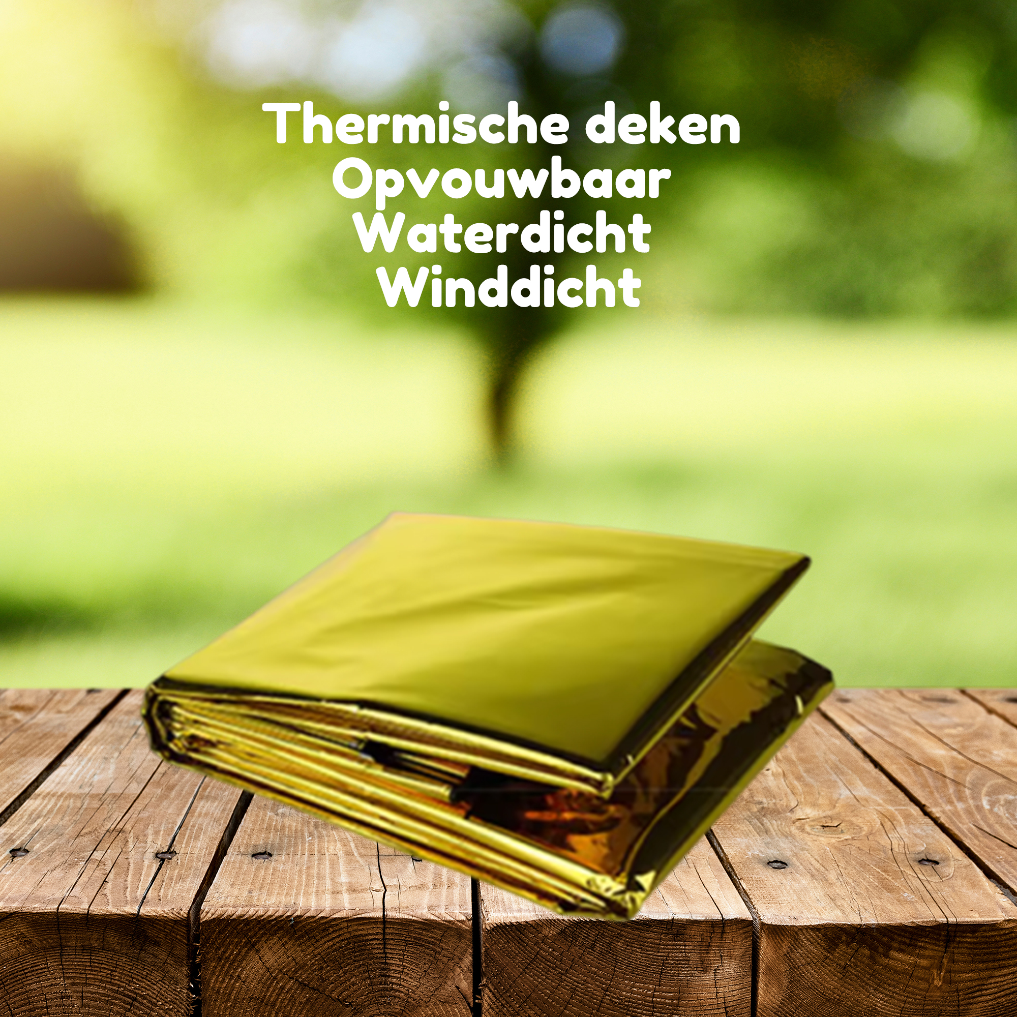 De stevige goudkleurige survivaldeken helpt je lichaamstemperatuur vast te houden en biedt bescherming tegen wind, kou en regen. Ideaal bij ongelukken, shock, outdooractiviteiten of extreme weersomstandigheden.