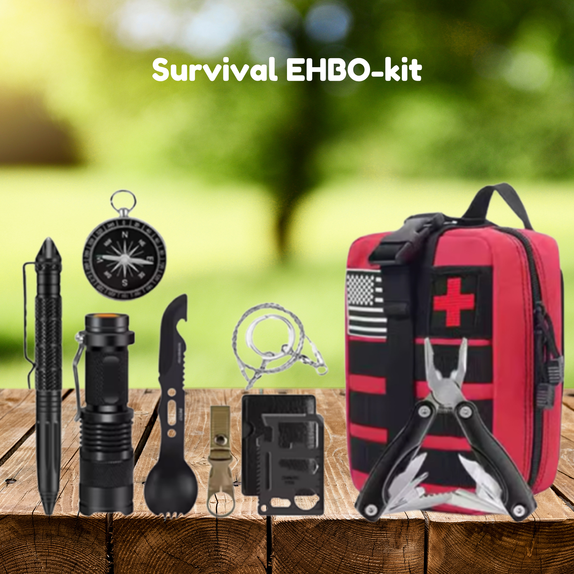 De meegeleverde EHBO kit bevat alle essentiële hulpmiddelen om verwondingen of incidenten direct te behandelen. Denk aan pleisters, diverse verbanden, ontsmetting, tape, pincet, schaar en meer. Alles is overzichtelijk ingedeeld in een compacte, waterafstotende rood-zwarte tas.