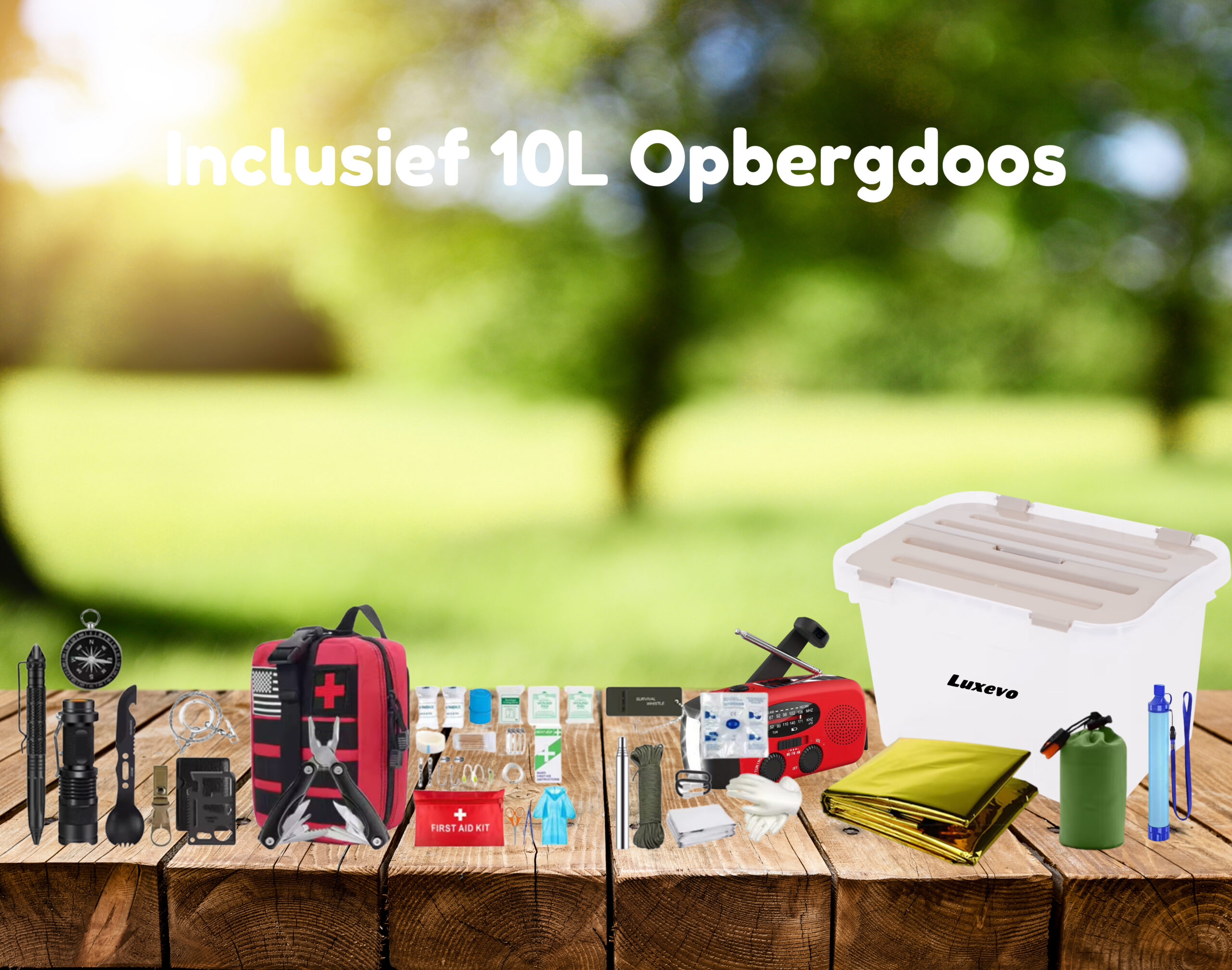 Wees altijd voorbereid op het onverwachte met het Luxevo Noodpakket – een complete en doordachte samenstelling van essentiële noodbenodigdheden voor situaties zoals stroomuitval, autopech, noodweer, kamperen of andere onvoorziene omstandigheden. Dit uitgebreide pakket combineert veiligheid, verlichting, communicatie, warmteregulatie en waterzuivering in één compact en overzichtelijk systeem. Alles wordt geleverd in een stevige 10 liter Luxevo opbergdoos, zodat je het noodpakket altijd klaar hebt staan wanneer het nodig is.